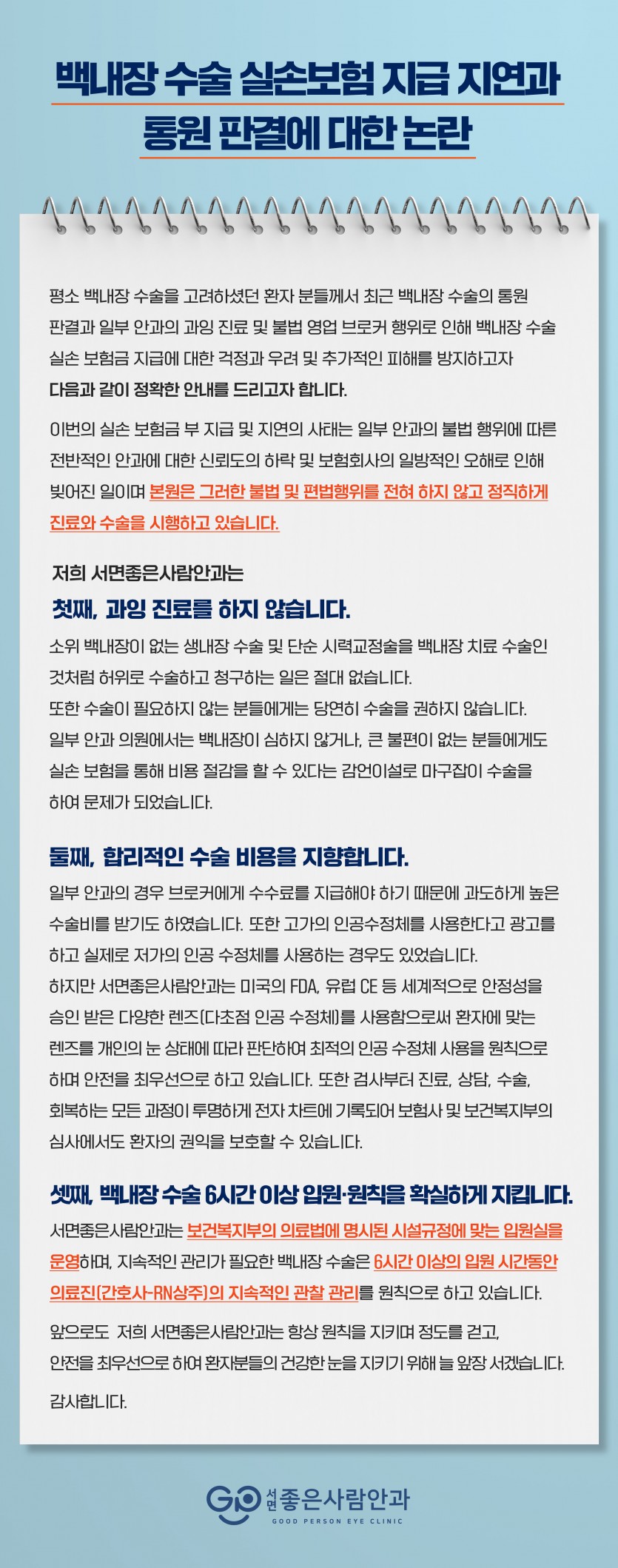 좋은사람안과 고객님의 개인정보를 중요시하며 “정보통신망 이용촉진 및 정보보호”에 관한 법률을 준수하고 있습니다. 병원은 개인정보 취급방침을 통하여 고객님께서 제공하시는 개인정보가 어떠한 용도와 방식으로 이용되고 있으며, 개인정보보호를 위해 어떠한 조치가 취해지고 있는지 알려드립니다.