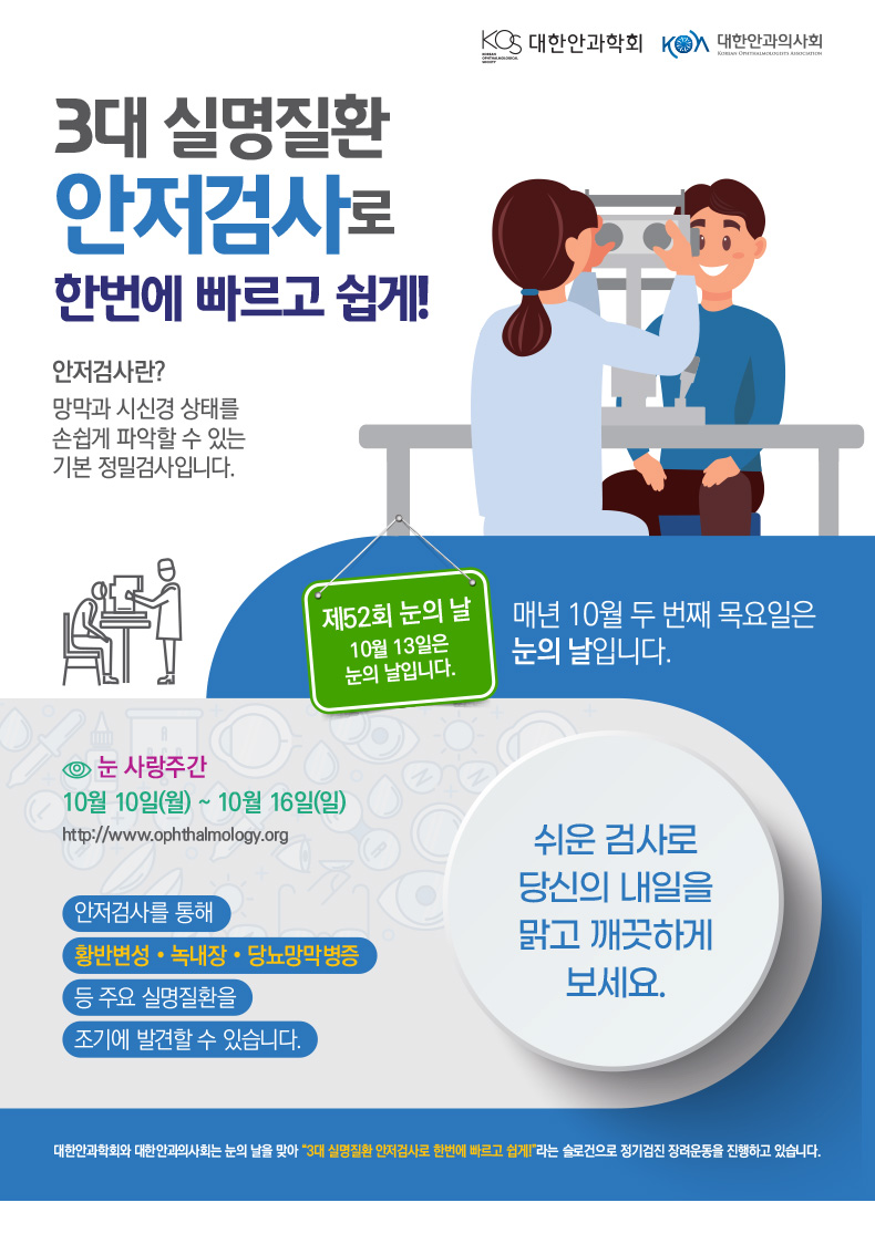 대한안과학회에서는 매년 11월 11일을 눈의 날로 기념하였으나, 2017년부터 세계보건기구(WHO)가 정한 세계 눈의 날에 맞춰 10월 두번째 목요일로 기념하고 있습니다.